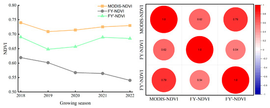 The Pearson correlation coefficient was used to characterize the correlation between the NDVI datasets from different sources. A positive and larger value of the correlation coefficient, r, indicates that the trends of the two datasets are more similar in the selected time period, while a negative and smaller value of the correlation coefficient, r, indicates that the two datasets have opposite trends in the selected time period.