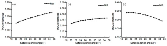 Effect of the satellite zenith angle on the TOA reflectance values in the red band and NIR band. (a) shows the variation curve of the TOA reflectance of the red band with the satellite zenith angle when it is lower than 0.2. (b) shows the variation curve of the TOA reflectance of the NIR band with the satellite zenith angle when it is lower than 0.2. (c) shows the variation curve of the TOA reflectance of the NIR band with the satellite zenith angle when it is below 0.4.