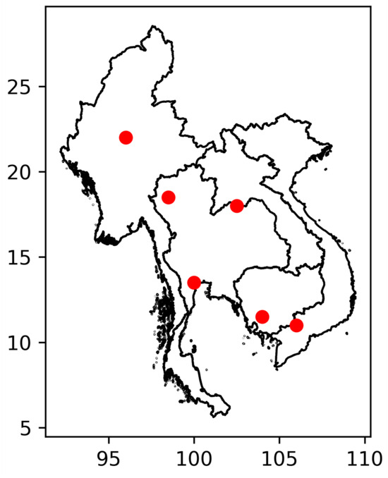 The observational data used in this work include meteorological observations and satellite observation data. Meteorological observations were derived from (https://rp5.ru/, accessed on 10 October 2023), including surface air temperature, relative humidity and barometric pressure, and the stations selected for this paper were surface meteorological observation stations in six cities, including Bangkok, Chiang Mai, Vientiane, Phnom Penh, Ho Chi Minh and Mandalay. The position of the observations in PSEA is shown in Figure 3.