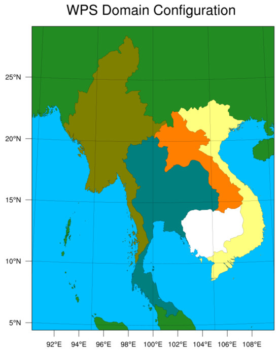 In this study, two simulations were carried out by using the WRF-Chem Version 3.9.1 (available at the following link: https://www2.mmm.ucar.edu/wrf/users/download/get_source.html, accessed on 10 October 2023). The adopted domain (see Figure 4), covering five Southeast Asian countries and part of China, was composed of 80 × 100 grid points, with a horizontal resolution equal to 27 km. The vertical domain was composed of 38 layers from the surface up to 50 hPa.