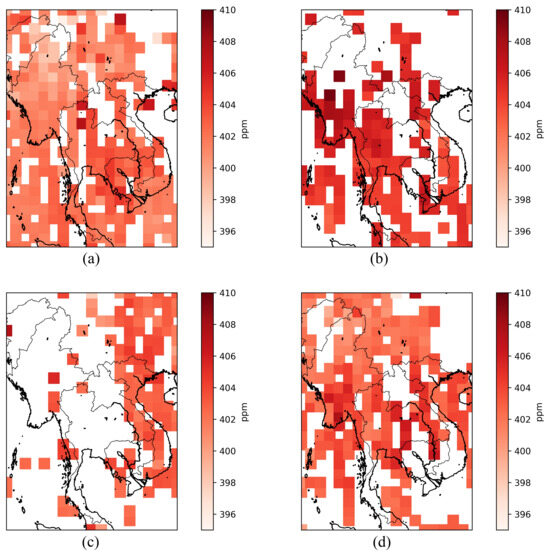 The amount of CO released from biomass combustion is considerable and will inevitably affect air quality. The spatial distribution of seasonal means of XCO for the months of January, April, July and November 2016 were selected, as displayed in Figure 5. The mean value of CO in January, April, July and November was 404.54 ppm, 405.27 ppm, 402.81 ppm and 402.14 ppm, respectively.