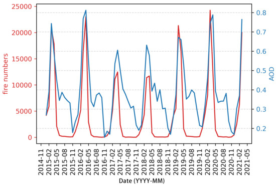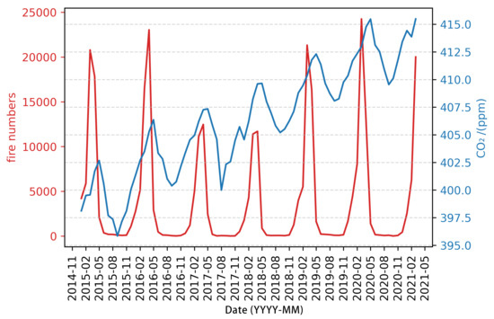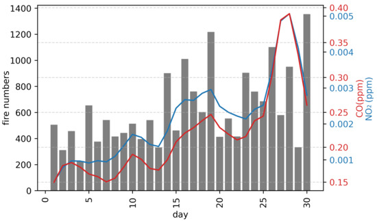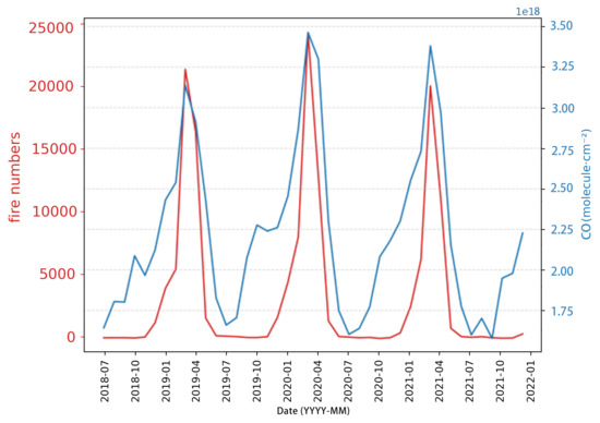 As shown in Figure 8, the time series plot of CO concentration (blue curve) changed with the number of fire points (red curve), the extreme value of CO concentration and the number of fire points always emerged at the same time and the change of CO concentration exhibited a U-shaped trend, which indicates that CO could serve as an effective indicator to evaluate the pollution degree of the atmosphere caused by local fires.