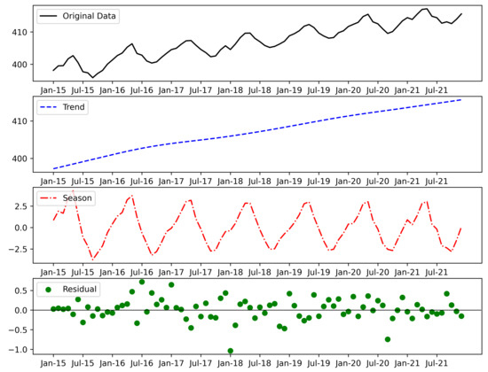 where Yv is the observed value at the moment of V; Tv, Sv and Rv are the trend term, seasonal term and residual term at the moment of V, respectively. The STL time series decomposition can reveal the trend, cycle length and random fluctuation range of CO with the time series. As shown in Figure 7, due to the long lifetime and easy accumulation of CO, CO generally gradually increased from 2015 onwards, with an obvious periodicity (the period was 12 months), reaching a great value in spring and a very small value in autumn, and it can be seen from the residual term that the residual term in the front of the time series fluctuated slightly more significantly than that in the back of the time series, which suggests that CO was weakened by the disturbances caused by fire elements.