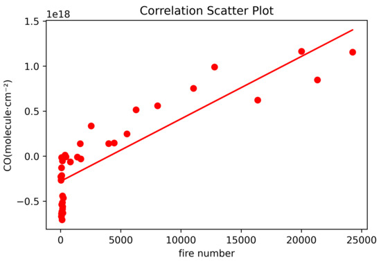 To further investigate the relationship between the monthly mean CO concentration and the number of fire points, we performed a correlation analysis between the number of fire points every month and the difference between the monthly CO concentration and the annual mean. Figure 9 compares the correlation between the number of fire points per month and the CO distance from the mean. The two were strongly correlated, with a Pearson correlation coefficient R of 0.87.