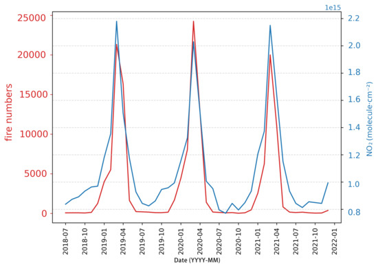 The EMI satellite payload monitoring tropospheric NO concentrations during the 2019 Australian fires showed a strong correlation between NO concentrations and the number of fire spots and degree of combustion during the fires as reported in a previous study [30]. Ilann Bourgeois et al. [31] measured hundreds of plumes from summer wildfires in the United States on flights in a DC-8 aircraft, and found that the fire smoke contained a significant amount of NO. We used the high-resolution Sentinel- 5P satellite Level 3 offline data product to calculate monthly averages of NO concentrations in the study area. The results showed that the average values in 2019, 2020 and 2021 were × (molecule × cm); the 2020 average was × (molecule × cm); and the 2021 average was × (molecule × cm), with the annual maxima being 2.64, 2.63 and 2.65 times the minima, respectively. As shown in Figure 10, the concentration of NO (blue curve) obviously increased with the number of fires (red curve), and like CO, the concentration of NO also exhibited a U-shaped trend, which was more in line with the number of fires than that of CO. Figure 11 shows the correlation between the number of fire points per month and the NO distance from the mean. The Pearson correlation coefficient between the monthly number of fire points and the NO distance from the mean was 0.95, and NO concentration had a stronger correlation with fire points than CO concentration because: The economy of Southeast Asia is less developed, anthropogenic activities cause less NO emission, and most of the emissions are caused by fires. Further discussion is needed on other reasons for the stronger correlation between fire and NO emissions.