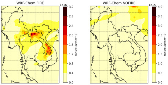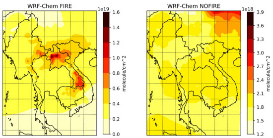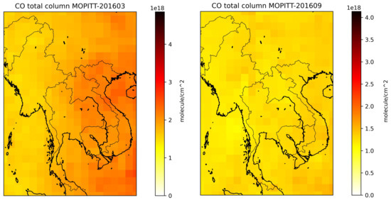 Since the Sentinel-5P satellite has not yet been launched in 2016, we assessed CO concentrations during the WRF-Chem simulated fires based on MOPITT satellite measurements. The monthly average CO concentrations in the March fire season and the September non-fire season observed by the MOPITT satellite were × (molecule × cm) and × (molecule × cm), respectively, shown in Figure 13, meaning that CO concentration caused by fires increased by about × (molecule × cm). However, the average CO concentration, accounting for fire emission simulated by WRF-Chem, was × (molecule × cm); the CO concentration without fire emission was × (molecule × cm), meaning that CO concentration caused by fires was increased by × (molecule × cm). It suggests that the model successfully simulated the CO concentrations, and the FINN fire emission inventory slightly underestimates CO emissions, while the MEGAN biomass respiration inventory may have overestimated CO emissions, and it is recommended that these two inventories be reassessed. Comparison of the MOPITT satellite remote sensing data in the fire and non-fire seasons demonstrated that this model and inventory had a better numerical simulation capability for CO.