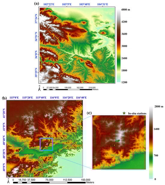 The location and elevation of the study areas. The overall regions of the FY-3D LST retrieved images of study area-I (a) and study area-II (b), and (c) the locations of the in situ stations.