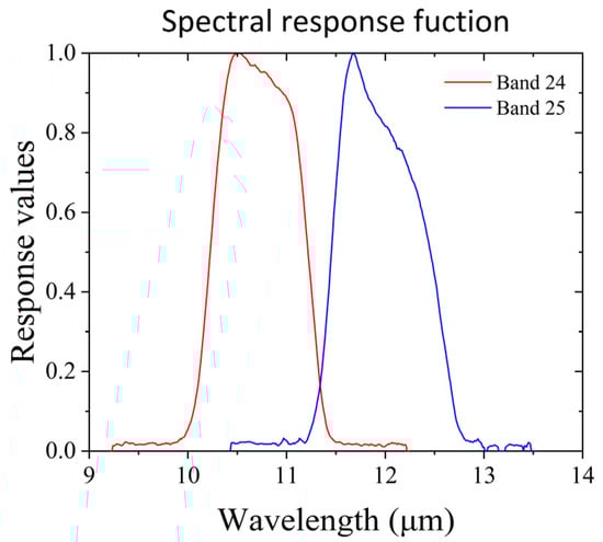 Fengyun-3D (FY-3D) is the fourth satellite of the Fengyun series, and it was launched on 15 November 2017 at Taiyuan Satellite Launch Center, China. This polar-orbiting satellite carries the Medium Resolution Spectral Imager (MERSI)-II, and the ground application system of Fengyun-3D consists of a global data acquisition station network with ground stations at the North and South Poles plus four domestic ground stations, for the first time realizing two-hour global complete detection data acquisition. There are 25 channels whose spectral ranges from 0.412 to 12 μm, including two spatial resolutions of 250 m and 1000 m. The center wavelengths of the two thermal infrared spectra are respectively 10.8 μm for band 24 and 12.0 μm for band 25, which can be downloaded at http://satellite.nsmc.org.cn/PortalSite/Data/Satellite.aspx (accessed on 1 January 2019). Their spectral response functions are shown in Figure 2. In this study, the thermal infrared radiance of band 24 (250 m) is used to retrieve the LST by using the single-channel algorithm with a noise equivalent temperature difference (NETD) of 0.4 K. Band 2 (red) and band 4 (near-infrared) are used to obtain the normalization vegetation index (NDVI) at the FY-3D satellite transit time, and they are further used to calculate the land surface emissivity (LSE) by the NDVI threshold method.