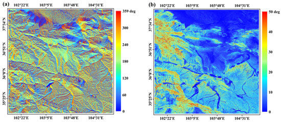 where S is the slope angle, A is the aspect angle, ϕ is the searching azimuthal angle, and Hϕ is the horizontal angle, which is the angle between the normal line of the horizontal plane and the line which connects the target pixel and surrounding pixels. The search range of this study area is determined as 5 km, and there are 16 search directions, which are 0°, 30°, 45°, 60°, 90°, 120°, 135°, 150°, 180°, 210°, 225°, 240°, 270°, 300°, 315°, and 330°. In addition, the S and A are calculated by a third-order inverse distance squared weighted difference method [40].