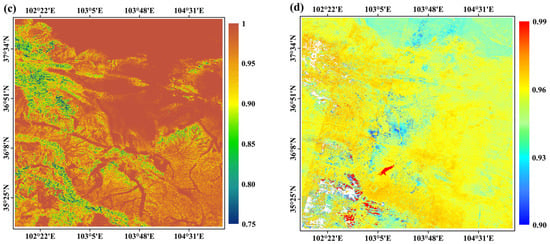Figure 3 shows the spatial extent of study area-I including (a) the aspect angle, (b) the slope angle, (c) the SVF, and (d) ASTER GED soil emissivity obtained from the NDVI threshold method. The slope angle values of the northeast part are close to 0°, and the area has an elevation of about 1200 m, which represents the lowest level in this region. Most flat surfaces are distributed in this area, with 0° aspect angle values. Mountains are predominantly located in the western region, and the smaller SVF values are located in this region. Meanwhile, the areas with larger slope angle values are consistent with the areas of smaller SVF values and various aspect angle values. The ASTER GED soil emissivity ranges from 0.90 to 0.99, and the emissivity distribution is around 0.96 in most regions. However, obvious banding effects and missing values exist in the ASTER GED products, which can cause significant errors in the LST retrieval. The white regions in Figure 3d represent missing values from the ASTER GED products. In the subsequent LST retrieval algorithm, these pixels are filled with the average values of the bare soil emissivity.