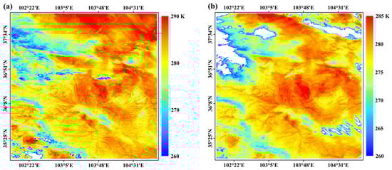 Figure 4 shows the spatial distribution of the retrieved LST images using FY-3D data in the Kunlun Mountains. In this study, four images with different UTC times are selected to retrieve the mountainous LST. Higher LSTs are found at lower altitudes, while LSTs below 260 K are found for higher altitude areas. The LST minimum occurs at the northwest area of the images, and has an elevation higher than 1400 m. In these regions, the higher slope angle areas are equivalent to the smaller SVF value areas in Figure 3b,c. There are cloudy pixels in the LST images at 05:45 UTC on 10 November and 05:25 UTC on 11 November, which are not considered in this study. The LST spatial distribution varies over time, and these images have similar distribution patterns at adjacent UTC times even with different dates. Retrieved images at 05:45 UTC and 05:25 UTC show similar trends in Figure 4a,b, and at 19:25 UTC and 18:30 UTC in Figure 4c,d there are similar LST distribution intervals. The LST ranges from 260 K to 290 K in Figure 4a,b, whereas the LST ranges from 250 K to 275 K in Figure 4c,d. In addition, the LST spatial distribution trend is continuous and reasonable in free-cloud pixels. White pixels are cloudy regions and are not considered in the retrieval process.