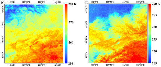 Spatial distribution of retrieved LST images from FY-3D band 24 with the terrain correction effect on (a) 10 November (05:45 UTC time), (b) 11 November (05:25 UTC time), (c) 11 November (19:25 UTC time), and (d) 14 November (18:30 UTC time) in 2021.