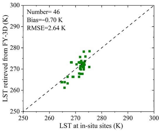 Five in situ sites are also used to further demonstrate the accuracy and precision of the iterative single-window algorithm. The overall RMSE and bias between the in situ sites in the Yanqing Zone and retrieval from the FY-3D LST are respectively −0.70 K and 2.64 K. The LST retrieval algorithm performs better at in situ sites A1701 and A1702 with the available cloud-free data.
