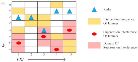 An example of jammer and radar countermeasures, where L = 8, Mint = 2, and Mtran = 1. The small blue triangle represents the working carrier frequency of the radar, the yellow block represents the detection frequency of the jammer, the small red circle represents the center frequency of the strong suppression interference generated by the jammer, and the pink block represents the frequency affected by the suppression interference.
