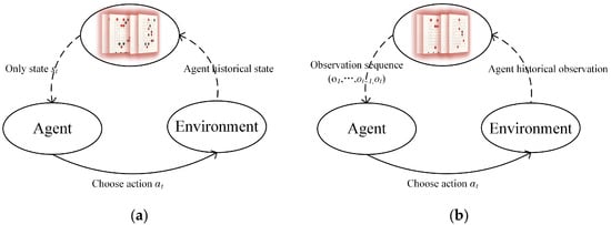 In Figure 3, using the example of Chinese chess, the differences between the MDP and POMDP models are illustrated under the reinforcement learning framework. In the MDP model, the red agent can observe the position of any chess piece on the board, allowing it to have full knowledge of the agent’s state. The current state of the chessboard is due to the interaction between both of the players and contains all of the historical state information. Therefore, the red agent can play chess solely based on the current state of the chessboard. On the other hand, in the POMDP model, the red agent can only observe the positions of their pieces. They lack information about the opponent’s pieces unless they attack. To make informed decisions, the red agent can rely on the sequence of historical observations to infer the possible positions of their opponent’s pieces and then determine their next move.