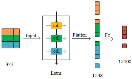 The Q-network with an LSTM structure is depicted in Figure 4. The input consists of a matrix formed by the agent’s historical observations. Then, it is processed by the LSTM network to extract the relevant information, where the input size of LSTM is 3, the output size is 16, and the number of layers is 1. The relevant information will be flattened to hidden information, and the fully connected layers are used to select the optimal action and compute the value. Subsequent experiments have demonstrated that LSTM, and other time-sensitive networks, such as a Recurrent Neural Network (RNN) [35] and Gate Recurrent Unit (GRU) [36], can achieve excellent performance in tackling the partially observable problem.