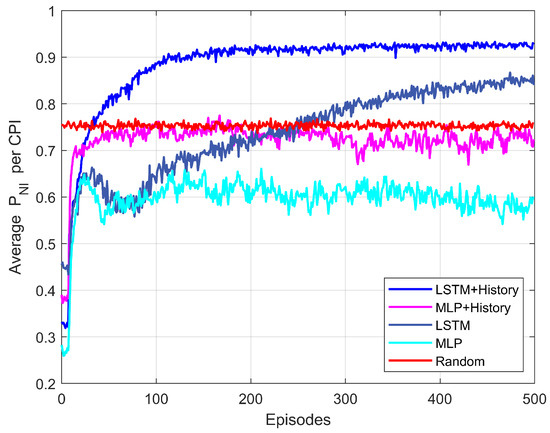 ‘MLP + History’ is represented using two FC layers to extract the historical observation information. After stabilization, the PNI is 0.73, and the number of frequency hops is 53. Comparing the ‘LSTM + History’, the PNI decreases by 0.19, and the number of frequency hops increases by 11. Because MLP networks only extract information from an overall perspective and cannot capture the information between the individual layers of the observations, this means that the MLP is not sensitive to the time dimension information. On the other hand, LSTM can exploit the hidden information when dealing with the time series. Based on these results, we can see the advantages of LSTM in handling multi-layer historical observations.