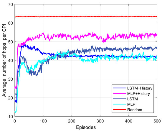 In this study, we recognized the uniqueness of radar frequency hopping anti-jamming and aimed to address the partially observable nature of the problem by incorporating historical observations. Considering that the temporal correlations within historical observations cannot be effectively captured by the FFNs, we drew inspiration from the literature [23] and introduced time-sensitive networks within deep reinforcement learning to exploit the temporal dimension information. In subsequent experiments, we observed that agents using time-sensitive networks show good anti-interference capabilities. The LSTM-based agent exhibits the minimum number of frequency hopping times. Therefore, in this paper, we choose LSTM as the Q-network for deep reinforcement learning. Although LSTM has been used in a previous study [18], its purpose was primarily to enhance the performance through increased network complexity, rather than leverage time sensitivity characteristics. In addition, the method of combining LSTM with historical sequences is mentioned in the literature [24], however, the focus of this previous paper is different to ours. In [24], the researchers constructed the process of radar fighting jammers as an MDP. In this process, the jammer is not unknown to the radar, and when they set the historical sequence, the radar observations are all of the jammer’s actions. In addition, the literature [24] does not analyze the impact of the length of a historical sequence on the results. In this paper, we construct the jammer–radar confrontation process as a POMDP. The jammer is unknown to the radar. The observation data in the observation sequence are based on the radar and do not directly contain jammer information. Regarding networks, the authors in [24] merely verified that LSTM has advantages over the Convolutional Neural Network (CNN) and FFN when processing historical sequences; however, they did not use another time-sensitive network to analyze whether these advantages are general characteristics related to time sensitivity rather than the unique capabilities of LSTM.
