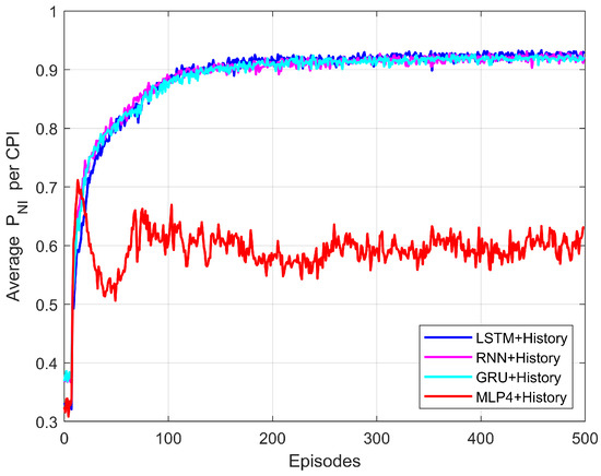 ‘MLP’ represents the agent that uses only a single-layer observation as the input, and the Q-network structure consists of two FC layers, which is a common approach used in previous studies [16,17,19]. After stabilization, the PNI is 0.6, and the number of frequency hops is 44. When comparing ‘MLP + History’, by removing the three layers of historical observations, the PNI decreases by 0.13. The multiple layers of historical observations improve the radar anti-interference to some extent. However, due to the limitations of the MLP structure, these results are still not good.