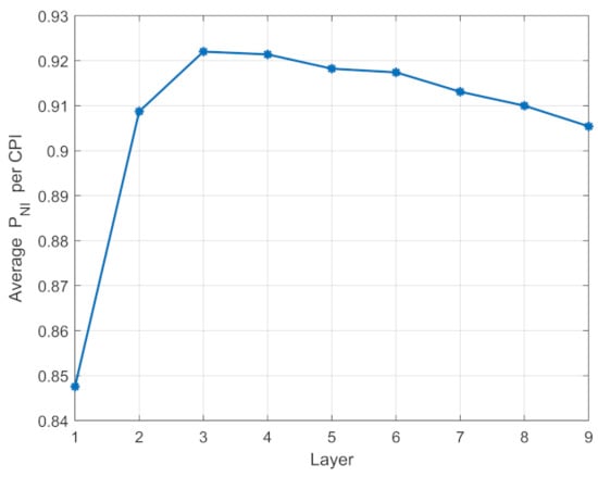 As shown in Figure 10, the PNI reaches 0.905 when using nine layers of historical observations. The PNI is the lowest, at 0.847, when using only one layer of observation. When the number of layers of historical observations is less than three, the performance is poor, due to the lack of temporal information. Notably, due to the introduction of the time dimension, the improvement in the performance is most significant when the number of layers of historical observations increases from one to two. The peak performance is 0.922 when there are three layers of historical observations. However, increased layers of historical observations do not always lead to a better performance. When using excessive layers, the temporal dimension may span multiple scan cycles of the jammer. For example, in the case of , , and , the interference source can disrupt all of the frequencies within 4–5 PRI. In this paper, the jammer adopts a frequency-sweep mode for detection. In each frequency-sweep cycle, due to the differences in the agent actions during the training, the jammer’s detection time for some carrier frequencies, the timing of performing strong suppression interference, and the frequency-sweep cycle time will be different. In addition, the jamming environment is unknown to the radar, and the radar can only infer the jammer’s strategy from its observation data. The data at different sweep periods contain slightly different jamming strategies, which increases the complexity of the radar learning from the observation sequence and may even be misleading. Therefore, the observations from other scan cycles could not provide information for the current prediction and may have a negative impact. Therefore, using five or more layers of historical observations results in a noticeable drop in performance.