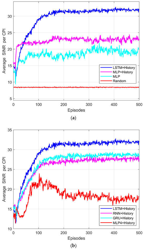 Figure 11 presents the total SINR of the above methods within one CPI. For ease of calculation and analysis, we assume that the SINR of the radar echo within one PRI is a fixed value when the radar successfully counters interference. After collecting the echo data of a CPI, the radar makes statistics on the anti-interference status of each PRI. If the radar can achieve anti-interference successfully, we record the PRI carrier frequency and SINR value, otherwise, we discard the data. After completing the CPI statistics, we perform coherent integration on the data with the same carrier frequency and then perform incoherent integration on the coherent results of each carrier frequency to obtain the total SINR of a CPI [17]. We assume that the recorded results of the two CPIs are [f1, f1, f2] and [f1, f2, f3], respectively. Since the coherence is greater than the incoherence gain, the frequency hopping strategy [f1, f1, f2] will be greater than another strategy [f1, f2, f3] in terms of the total SINR value when we fix the SINR value of each PRI. It is foreseeable that, although the random frequency hopping method may have a higher PNI, it also uses more types of carrier frequencies, which results in a smaller proportion of coherent integration with a CPI (even if only performing non-coherent integration). Therefore, we may obtain a lower total SINR when we use the random method. The labels in Figure 11a,b correspond to those in Figure 5 and Figure 7. The reinforcement learning methods shown in Figure 11a,b can achieve convergence. In Figure 11a, the total SINR value after convergence for each curve is as follows: ‘LSTM + History’ is 33, ‘MLP + History’ is 23, ‘MLP’ is 20, and ‘Random’ is 8. Under the total SINR metric for one CPI, we conclude that, while ‘MLP + History’ and ‘MLP’ methods are inferior to the ‘LSTM + History’ method, they each achieve significant improvements of 15 and 12, respectively, compared to the ‘Random’ method. Additionally, they exhibit faster convergence, typically achieving convergence within around ten episodes. In fact, as shown in Figure 5, the ‘MLP + History’ and ‘MLP’ methods do not yield improvements in the PNI relative to ‘Random’. Combining this with Figure 6, where the ‘Random’ radar mode maintains hopping frequencies, we can see that the increase in the total SINR is due to reinforcement learning based on the MLP networks, which reduces the radar frequency hopping times, thereby increasing the weight of the coherent integration in a CPI, resulting in a larger total SINR. The results shown in Figure 11b further validate our analysis. Despite the fact that, in Figure 7, the PNI results using the LSTM, GRU, and RNN networks are similar, in Figure 8, the LSTM + History mode has the fewest frequency hops and consequently achieves the highest total SINR. Despite the higher frequency hopping times that come with the GRU and RNN methods, their substantial improvements in successfully countering interference compared to the MLP4 network result in a higher total SINR value.