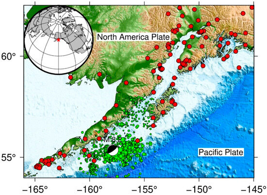 - Liu, C.; Lay, T.; Xiong, X. The 29 July 2021 MW 8.2 Chignik, Alaska Peninsula earthquake rupture inferred from seismic and geodetic observations: Re-rupture of the western 2/3 of the 1938 rupture zone. Geophys. Res. Lett. 2022, 49, e2021GL096004. [Google Scholar] [CrossRef]