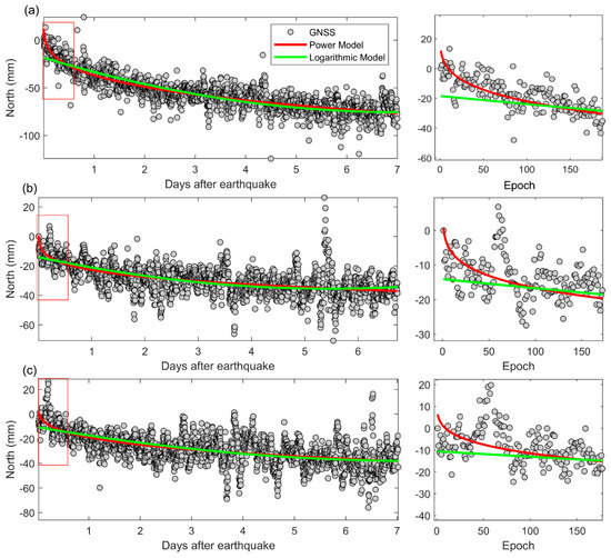 Comparison of fitting performance of power and logarithmic model. Comparison of subdaily GNSS solutions, power model, and logarithmic model for the sites AC13 (a), AC21 (b), and AB13 (c) in the north component. Red lines denote the power model, and green lines denote the logarithmic model. Right panels display the enlarged details of the left panels.