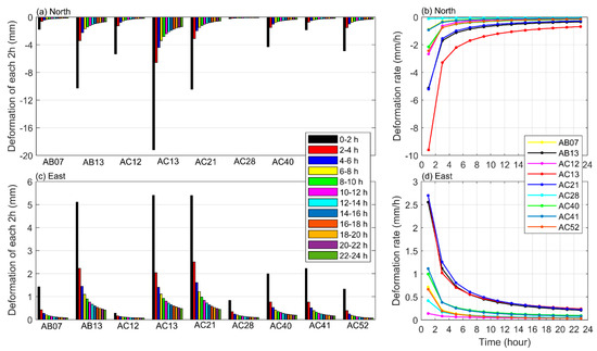 Postseismic deformations of each 2 h (a,c) and the corresponding deformation rate (b,d) at the 9 GNSS sites in the north and east component.