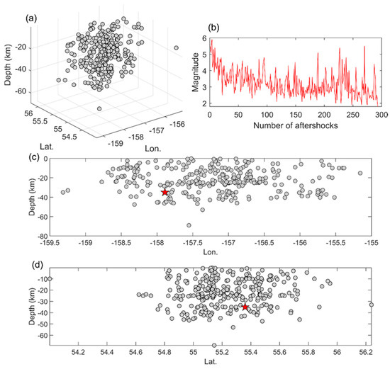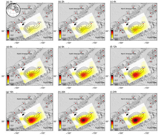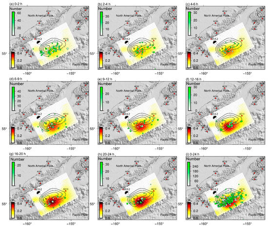 Meanwhile, we exhibit the spatio-temporal distributions of aftershocks in the near-field area (i.e., the longitude and latitude ranges are –160° to –154° and 54° to 57°) within the first 24 h following this earthquake (Figure 7). The aftershock catalog is provided by USGS, and the number of aftershocks within the first 24 h reaches 293. For the first 2 h, the number of aftershocks is the highest (reaches 64), indicating the seismic activities in this time span are strong (Figure 8). Most of the aftershocks occur in the patch of afterslip, which is also located at the southeast of the hypocenter. For the other 7 time spans, almost all aftershocks appear in the area of peak after slip, especially for the last 4 time spans (i.e., 9–12 h, 12–16 h, 16–20 h, and 20–24 h). Thus, the spatio-temporal distributions of aftershafter slipafterslip exhibit strong similarity during the first 24 h. Some studies have revealed the similar distributions oafter slipocks and afterslip on the time scales of days to months [44]. The result confirms that the similar distributions of aftershocks and afterslips also exist within the first several hours after this earthquake. Moreover, the result suggests that the very early afterslip may be a triggering mechanism for aftershocks in addition to the effects of coseismic stress.
