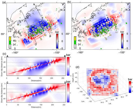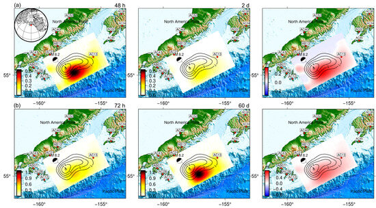 Figure 5a displays the coseismic slip distribution provided by Elliott et al. [28], and the maximum slip of about 6 m is situated at the depth of 32 km. Compared with coseismic slip, the cumulative afterslip of the first 24 h is mainly focused on the southeast margin of the hypocenter, implying that a shallow slip of the fault is appeared after this earthquake. Meanwhile, there is a partial overlap between coseismic slip and afterslip (Figure 5b). The maximum value of the first 24 h afterslip (i.e., 0.43 m) accounts for ~7% of the maximum coseismic slip, which is situated at the latitude of 55.09°, longitude of −157.19°, and depth of 21.8 km. The released moment magnitude of afterslip is equal to an earthquake of ~Mw 7.4. The correlation of GNSS-derived and SDM-modeled postseismic deformations reaches 0.99, implying the result of fault slip inversion is reliable.