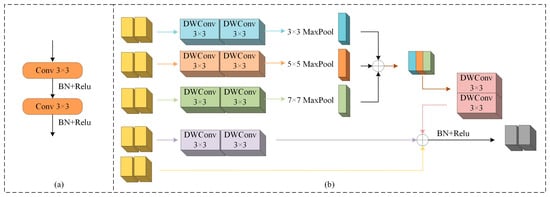 In the upsampling process, high-level semantic and spatial information often results in a rough final segmentation boundary, especially when dealing with arbitrary and irregular UGS sizes and shapes, making UGS boundary segmentation challenging. Some existing methods segment the boundaries very coarsely and lack detail. As shown in Figure 3a, this paper uses two layers of 3 × 3 convolution, normalization, and activation functions to form a DE module to enhance the ability to obtain information when extracting features. As shown in Figure 3b, this article uses DWConv convolution [] to form a BFF module, which can learn richer detailed features while reducing the amount of calculation parameters. During the training phase, multiple DWConv convolution combinations can enhance the representation of UGS information features. Maxpool is used to extract feature information. We used three maxpool layers of 3 × 3, 5 × 5, 7 × 7, respectively, to achieve UGS feature information extraction in parallel. To a certain extent, it can extract texture and edge information in the image, reduce interference from non-green space areas in the HRS image, and more effectively identify scattered multiscale objects, thereby reducing the risk of missed segmentation and false segmentation. At the same time, we keep an input channel in the side to preserve the integrity of the input information. The new decoder module has the potential to promote MAFANet model segmentation of UGS.