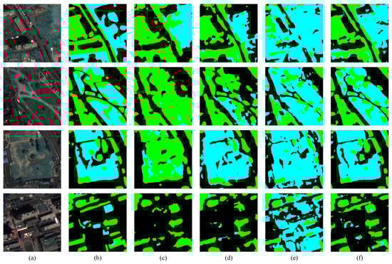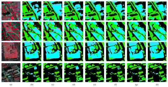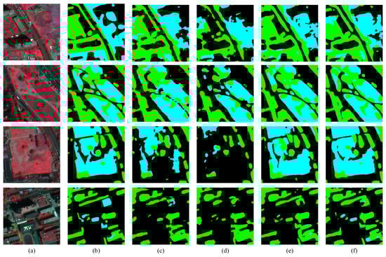 In general, the fusion feature engineering can effectively improve the segmentation accuracy, and the above improvement strategy proves the effectiveness of the fusion feature engineering method. At the same time, several representative remote sensing images are selected for visual analysis, and the results are shown in Figure 13. After blending false color and NDVI feature engineering, the boundary of UGS is further distinguished. MAFANet’s UGS segmentation is more accurate and is close to the real situation of the surface.