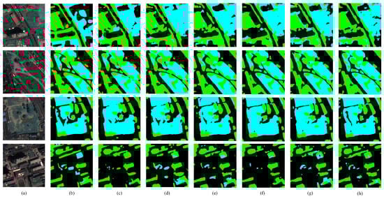 UGS-2 ablation experiment visualization results. (a) Input image; (b) Label; (c) baseline; (d) baseline+ DE; (e) baseline+ DE+ BFF; (f) baseline+ DE+ BFF+ Pyconv; (g) baseline+ DE+ BFF+ GAM; (h) baseline+ DE+ BFF+ MSPA.