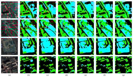 Feature engineering ablation experiment visualization results. (a) Input image (UGS-1); (b) Label; (c) MAFANet (NDVI); (d) MAFANet (UGS-1); (e) MAFANet (UGS-1+NDVI); (f) MAFANet (UGS-2); (g) MAFANet (UGS-2+NDVI).