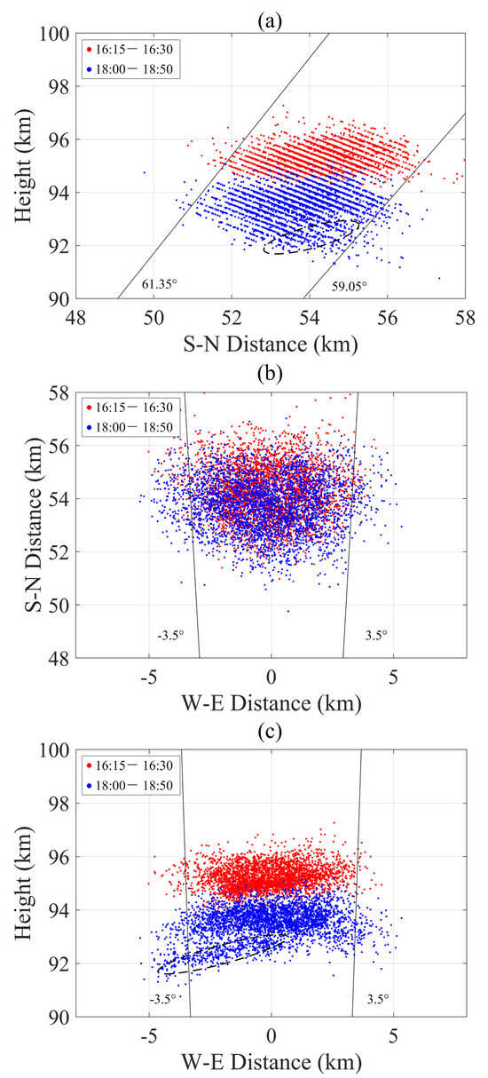To further understand the characteristics of LQP echoes, we discuss the overall spatial distribution of the irregularities. The phase spectrum of each data set was extracted, and the echo points that met the above requirements were screened. After the phase correction, the points were projected on the mutually orthogonal planes to represent the echo regions. Figure 3a shows the echoes during 16:15–16:30 LT and 18:00–18:50 LT projected in the vertical plane by the vertical and the north–south axes, where the solid lines on the left and right indicate elevation angles of 61.35° and 59.05°, respectively. The red and blue points represent the echoes during 16:15–16:30 LT and 18:00–18:50 LT, respectively. The echo region during 16:15–16:30 LT had a scale of about 5 km in the north–south dimension and of about 2 km in the vertical dimension, which looks like a parallelogram in space. This indicates that the irregularities move in the north–south direction regularly. The echo region during 18:00–18:50 UT had a scale of about 3 km in the vertical dimension, which is an irregular shape in space. The abnormal region is highlighted by black dashed lines, and it indicates that there are irregularities moving abnormally. Meanwhile, we found that the LQP structures were distributed in strips, which indicates that the LQP structures were distributed along the magnetic lines. Figure 3b shows the projections of the echoes in the horizontal plane, where the solid lines on the left and right indicate an azimuth angle of –3.5° and 3.5°, respectively. Different from the oblique stripes in Figure 3a, the echoes were randomly distributed in the region with a scale of about 8 km in the east–west dimension. Most of the echoes had azimuth angles within 7°, which is larger than the half-power width of the main lobe (4.6°). Therefore, some echoes were received by the side lobe of the antenna. The echo regions during 16:15–16:30 LT and 18:00–18:50 LT were almost overlapping in the horizontal plane, which indicates that the irregularities in the two time periods were generated in the same region. Figure 3c shows the echoes projected in the vertical plane by the vertical and the east–west axes. The echo regions during 16:15–16:30 LT and 18:00–18:50 LT had almost the same scales in the north–south dimension and the vertical dimension, except the abnormal region highlighted by black dashed lines in the height range of 91.8–93 km. The height was the same as that of the abnormal region in Figure 3a, and we will discuss the anomaly region further.