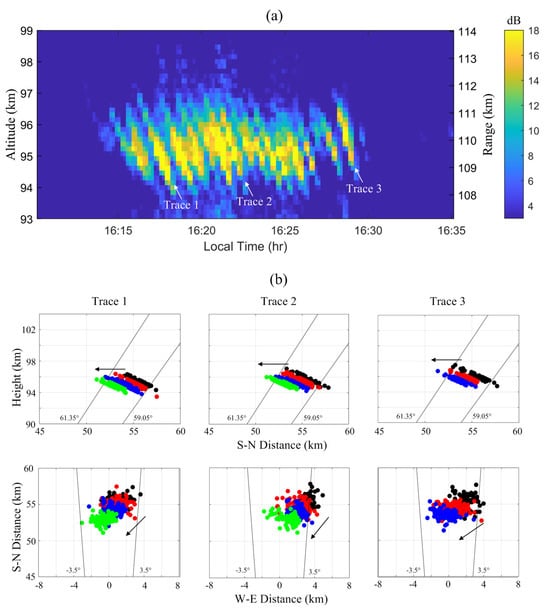 Figure 4a shows the LQP echoes observed during 16:15–16:30 LT. There were 14 significant LQP striations, with a height extension of 1 to 2 km and a period of about 64 s. The event lasted about 15 min, and all the striations had a negative slope. During the SEEK-2 campaign, the comparison of echoes obtained using the LTPR and the FAR revealed that echoing regions drifted with a southward velocity component, and the interferometry observation of the LTPR revealed that the negative range rate of the QP striations corresponded to a westward velocity component for the moving echoing regions [22]. Urbina et al. showed that the backscattering regions drifted in the westward direction [7], but Pan et al. found that a northwest to southeast drifting motion dominated within a preferential area [8]. To confirm what was happening in the case of the LQP structures, we tracked the positions of the LQP striations. The spatial structure of the LQP striations was reconstructed depending on the angular positions of the FAIs in the echoing region. To distinguish the state of each striation, we selected different colors to represent the spatial distributions of the irregularities at different times, and the arrows indicate the drifting direction of the LQP structures. Figure 4b shows the continuous changes in the spatial distributions for typical traces 1, 2, and 3 on the orthogonal planes. The plasma structures in traces 1, 2, and 3 moved southward at a trace velocity of about 44.0, 41.6, and 51.5 m/s, respectively. The plasma structures in traces 1, 2, and 3 moved downward at a trace velocity of about 8.3, 11.0, and 10.9 m/s, respectively, so they moved at an almost constant altitude. The plasma structures in traces 1, 2, and 3 moved westward at a trace velocity of about 26.8, 38.0, and 62.3 m/s, respectively. Therefore, the LQP structures in the three traces drifted southwestward almost horizontally. Due to the high aspect sensitivity, the plasma structures could only be observed in the elevation range of 59.05°–61.35°, so the plasma structures drifted into and out of the radar volume to form the LQP striations in the HTI plot.