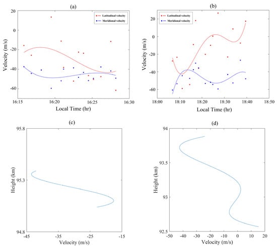 The mean projection velocities in the latitudinal and meridional directions of the striations during (a) 16:15–16:30 LT and (b) 18:05–18:40 LT. The height variations in the plasma structures’ latitudinal velocities during (c) 16:15–16:30 LT and (d) 18:05–18:40 LT.