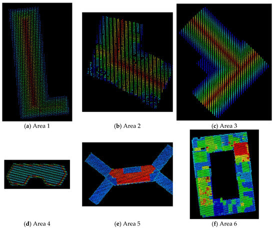 The test dataset has six test areas. Areas 1 to 3, provided by ISPRS (International Society for Photogrammetry and Remote Sensing), are located in Vaihingen, Germany, with a density of 4 points/m2. As shown in Figure 2, the point data are colored by the height value of each point. The higher the point, the redder the color. The detailed introduction of this dataset can be found in [33]. In order to enrich roof types, Areas 4 to 6 are added herein. The three datasets are located in Alashan, China with a density of 5 points/m2. However, the corresponding orthophoto is absent. All of the experiments were implemented in Matlab 2014b and the results were displayed in LiDAR_suite v1.4 (software developed by the authors).