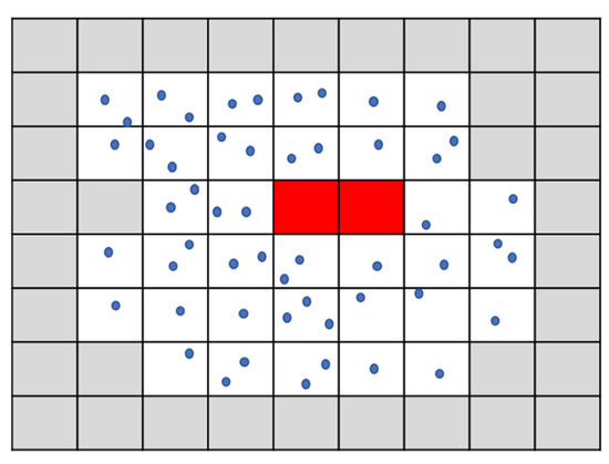 (2) Eliminating pseudo empty cells. In general, pseudo empty cells are corresponding to the void holes located inside the original roof due to loss of data, as red cells shown in Figure 3. These cells have an impact on the accurate extraction of edge points. Thus, these pseudo empty cells should be eliminated by counting the number of contiguous empty cells. For real roof edges, the empty cells should be the grey cells shown in Figure 3 with a relatively large quantity. As a result, if the number is too small (like 2 in Figure 3), these corresponding cells (red cells in Figure 3) can be considered as the pseudo empty cells and labeled to distinguish from the other cells.