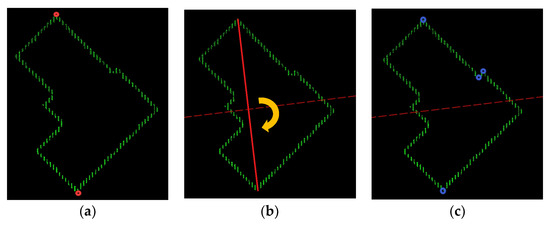 The diagram of a corner-point-detecting strategy based on the two-dimensional Euclidean distance with three steps: (a) searching for the two farthest points, (b) forming a line segment connecting the two farthest points and rotating the line segment to generate several segments every 15 degrees rotation and (c) detecting the corner points.