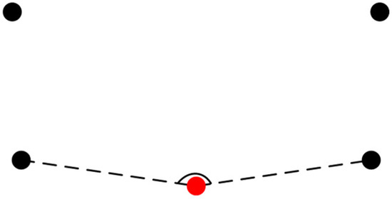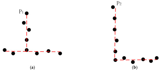 a. The two farthest points, and , in the edge point set are firstly detected as corner points, as shown in the red circles in Figure 4a. Adding them into the corner point set .