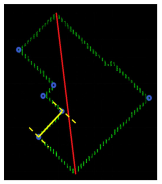 (5) Group fitting. Due to sequential storage, all edge points can be separated into several groups by the detected corner points, as shown in the yellow lines in Figure 6. In order to achieve stable line parameters, a gradient descent method is adapted to linear fitting.