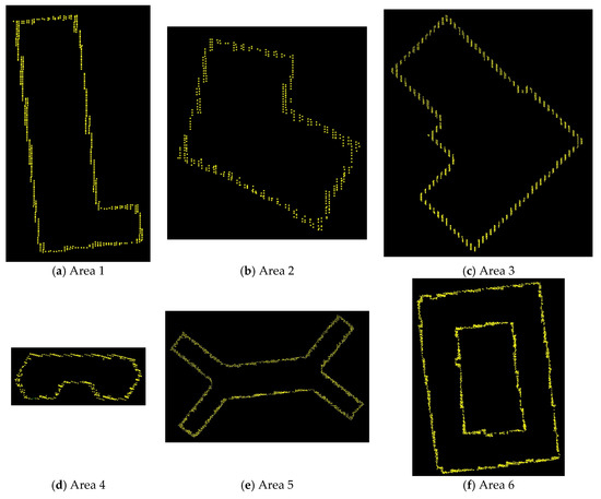 Further, the initial outlines cannot include all edge points, as shown in Figure 10. But these outside edge points should belong to the roof, which means that the initial outlines are smaller than its real range. Hence, coarse roof outlines are refined by normalization and expansion proposed in Section 3.2.2. The refined roof outlines are shown in Figure 11, where (a) to (c) display the refined outlines and the original point clouds for Areas 1 to 3 on the corresponding images repeatedly, while (d) to (f) show the results of Areas 4 to 6. Seen from Figure 11f, it is interesting that the inner outline (like a courtyard) can also be extended to the accurate direction using the proposed method.