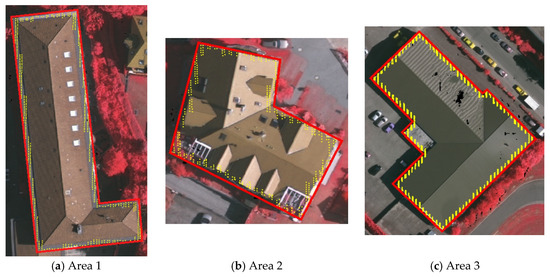 Due to lack of the corresponding orthophoto in Alashan, Areas 4 to 6 cannot conduct quantitative evaluation. It is noteworthy that the proposed method is able to obtain various types of roof outlines, including irregular roofs (Figure 11d,e) and the roof with a courtyard (Figure 11f), which achieves a promising visual results. Table 1 lists the results for 22 corner points in Areas 1 to 3 using mean square error of coordinates. The real coordinates of these corner points are measured manually using LPS module in ERDAS 2015 software, according to the orthophoto provided by ISPRS.