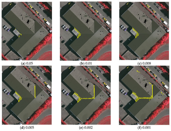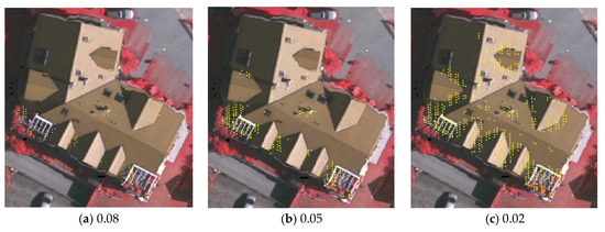 For oblique ridge lines and valley lines, the curvature value of each point is adopted as an evaluation indicator. In this section, this paper conducts several groups of experiments for determining the thresholds of curvature for different data, in order to find a suitable and rational threshold for each data. The results are shown in Figure 13, Figure 14 and Figure 15. It is noteworthy that when the threshold of curvature decreases gradually, more extracted points can be obtained; otherwise, when the threshold is too small, the points are extracted disorderly, which makes it difficult to extract feature lines efficiently. Seen from these three figures, the accessories in Area 2 are too various, which leads to unclear distinguishing boundaries of different groups of points. Thus, oblique ridge lines and valley lines in Area 2 are hard to extract accurately. In addition, the roof structures of Area 1 and Area 3 are relatively simple and each feature line is extracted separately, which can achieve promising results of extracting the subsequent feature lines.