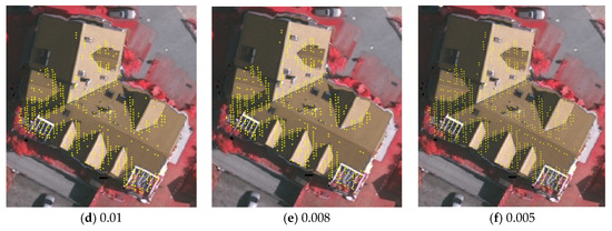 Figure 9 shows the extraction results of initial roof edge points. It is noteworthy that the edge points extracted by our proposed algorithm are dense and consecutive, which is helpful for the subsequent extraction of roof outlines. Figure 10 shows the extraction results of initial roof outlines, where yellow points represent the edge points and red lines represent the outlines. Seen from Figure 10, the two adjacent outlines are generally orthogonal to each other for regular building roofs on XOY projection plane. However, it is likely that there are several special outlines, as shown in white circles in (b). In addition, the real corner points that should be in the white circles in (f) cannot be extracted due to the space resolution of the original point clouds.