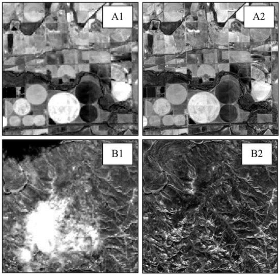 Training pair examples—(A1) L8 NIR and (A2) S2 Red Edge 2 (cloud free); (B1) L8 NIR (cloud obscured with shadow); (B2) S2 Red Edge 3.