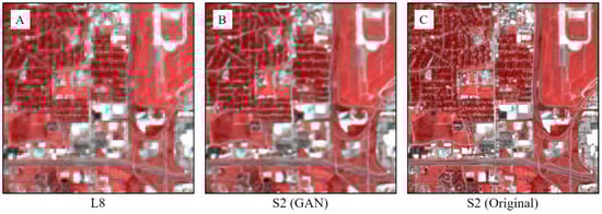 Figure 5 shows the S2-like green and NIR images translated by CGAN. Our CGAN downscaled L8 green (30 m) to S2-like green (10 m) at a scale factor of 3. The network increased the effective spatial resolution of the L8 green images which is noticeable through the clear and less pixelated edges of the river and roads in the translated image (Figure 5(A2)). Further, CGAN translated 30 m L8 NIR images to 20 m S2-like NIR narrow images by downscaling the images at a scale factor of 1.5. Even at a low scale factor, the translations by the network are sharper than the original L8 NIR images, as observed from the edges of the agricultural patches. According to the quantitative evaluation (Table 4), CGAN minimized spectral and spatial differences between the L8 and S2 images across all metrics. Most improvements can be observed through the increase in the spatial correlation coefficient (SCC), signifying that CGAN was able to reconstruct the finer spatial features of the higher-resolution S2 images accurately. Figure 6 shows layer-stacked images of the L8 and S2 images along with the translations. Each image in the figure (see Figure 6) is layer-stacked with NIR, green, and green (repeated), respectively. To layer stack the images, the 20 m S2-like NIR images were downscaled to match the 10 m spatial resolution of the S2 green band using bilinear interpolation. We observe (Figure 6) that the network increased spatial resolution of the L8 images which is most noticeable through the sharper road networks and building boundaries. Additionally, the network was able to maintain spectral fidelity as we did not observe any spectral distortion between the predicted and the target images.