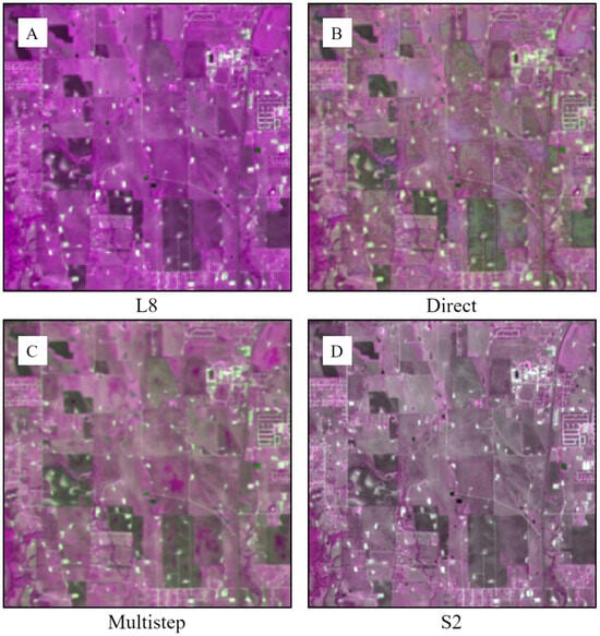S2-like RE1, RE2, and RE3 bands predicted by direct and multistep methods. (A) L8, (B) S2-like predicted by direct, (C) S2-like predicted by multistep, and (D) target S2. All images are stacked as, R: RE3, G: RE1, and B: RE2.