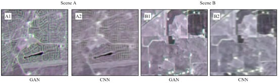 S2-like RE predictions by GAN and CNN from L8 with known misregistration errors between training pairs. Scene A and Scene B are translations by GAN and CNN. (A1,B1) Predictions by GAN; (A2,B2) Predictions by CNN. All images are layer stacked as (R: RE3, G: RE2, B: RE1).